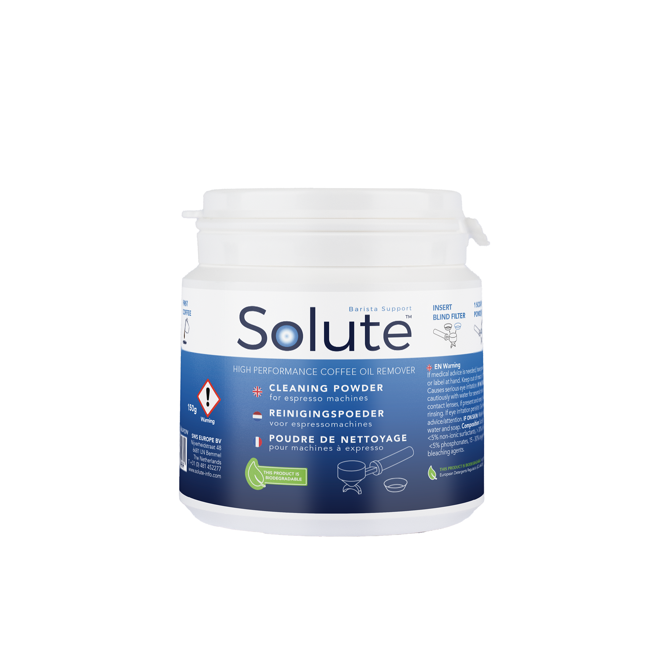 | 9484 | Solute reinigingspoeder 150g | Speciaal ontwikkeld voor het reinigen (blindfilteren) van half automatische espressomachines. | € 6,99 | | solute | reinigingspoeder solute-alle |