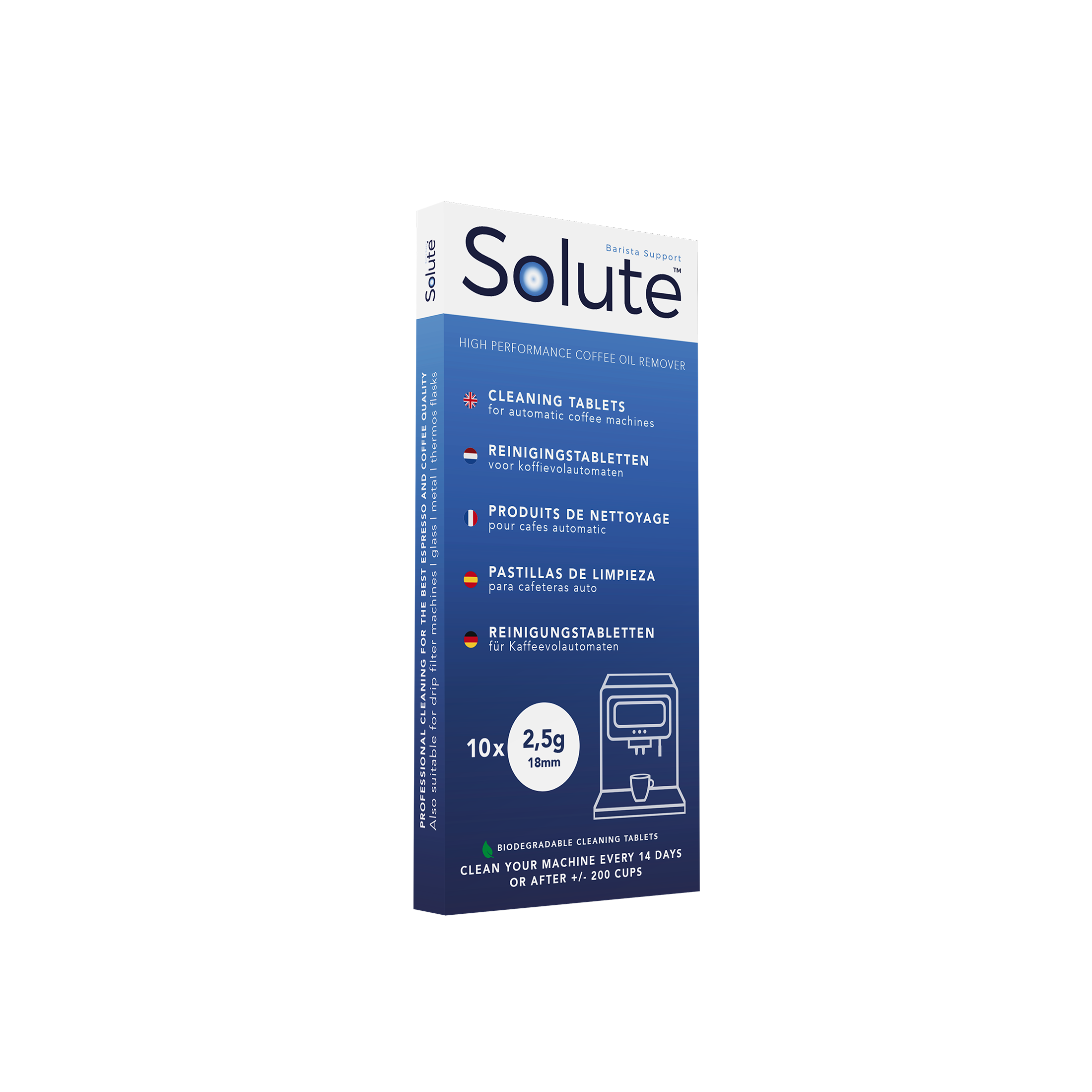 | 9026 | Solute reinigingstabletten 30x 1,6g Ø18mm | Equivalent voor o.a. AEG, Bosch, Gaggenau, Melitta, Philips, Saeco, Siemens, Breville, DeLonghi etc | € 21,99 | | solute | reinigingstablet solute-alle |